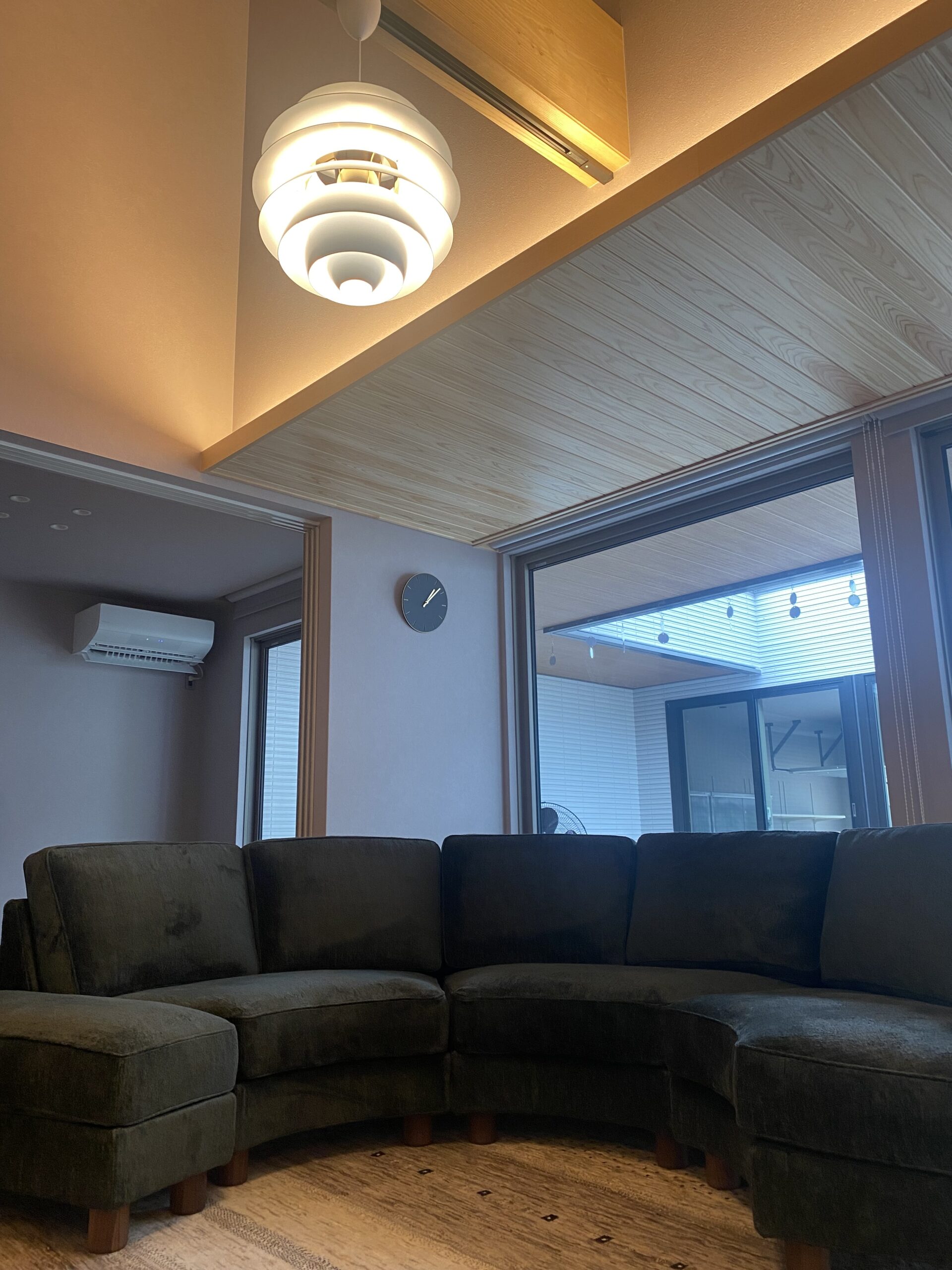 落ち着いた色味のカーブソファが、洗練されたリビングの主役となっています。柔らかな照明や木の質感と美しく響き合い、ホテルのような贅沢な雰囲気に。ゆったりと時を忘れて寛げる、上質なリラックス空間が完成しました。